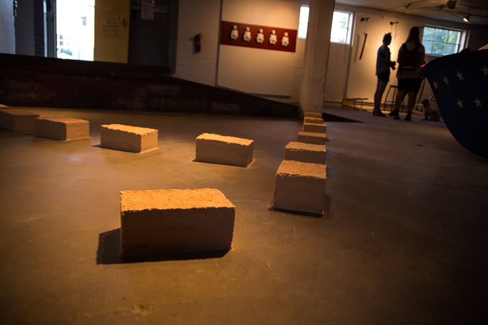 This piece traces out the contours of a room in a dotted line made from compressed sawdust blocks.